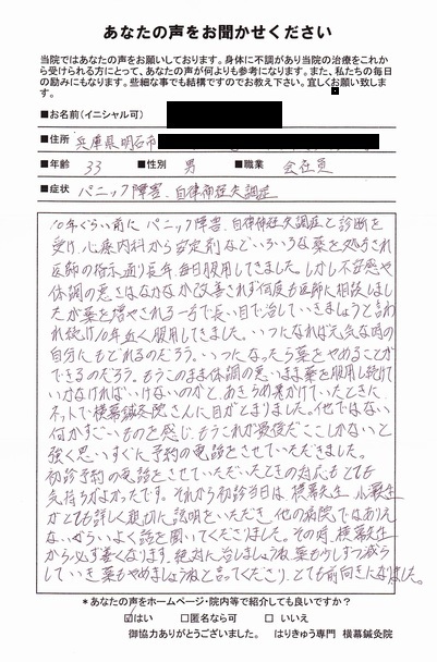 その時、横幕先生から必ず良くなります。絶対に治しましょうね。薬も少しずつ減らしていき、薬もやめましょうねと言ってくださり、とても前向きになりました。
